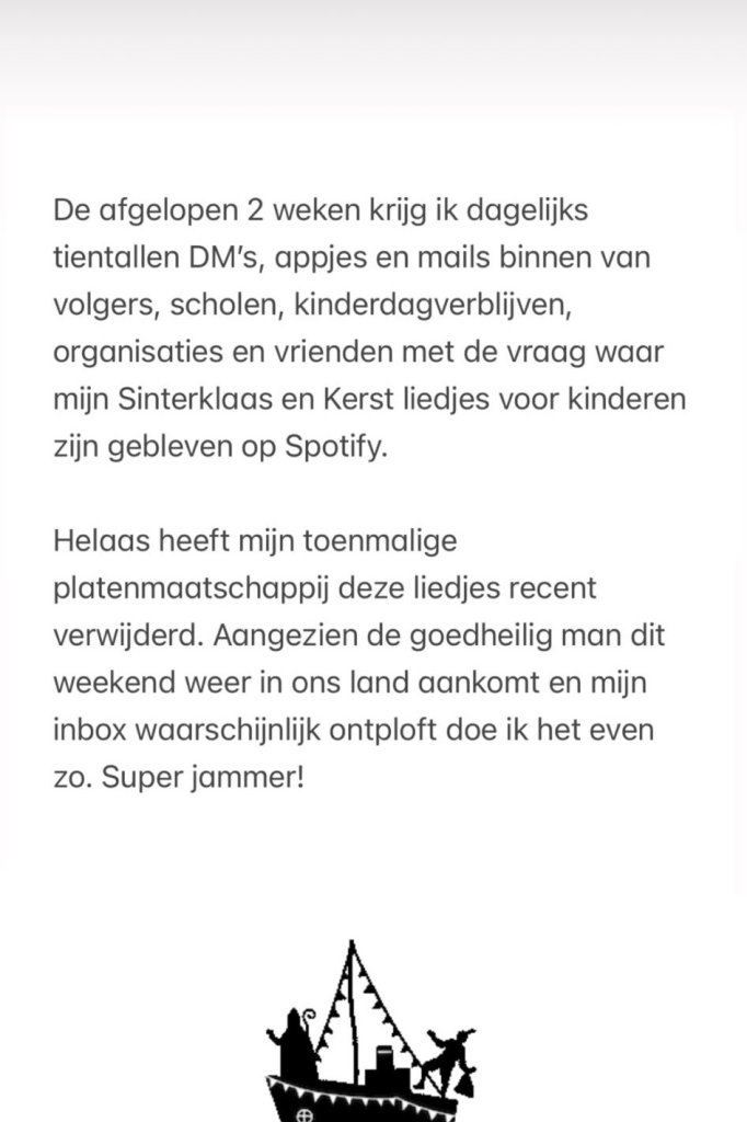 Monique vertelt dat haar inbox inmiddels overstroomt met berichten van bezorgde fans. “De afgelopen twee weken krijg ik dagelijks tientallen DM’s, appjes en mails van volgers, scholen, kinderdagverblijven, organisaties en vrienden met de vraag waar mijn sinterklaas- en kerstliedjes voor kinderen zijn gebleven op Spotify,” schrijft ze in haar Instagram Story.