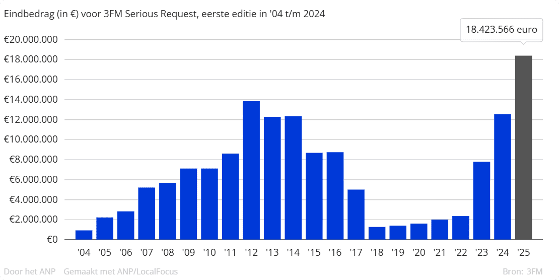 Het is een historisch moment, want nooit eerder haalde Serious Request op kerstavond zo’n hoog bedrag op. Het oude record, dat al sinds 2012 stond, werd overtuigend verbroken en dat maakt deze editie een van de meest succesvolle ooit.