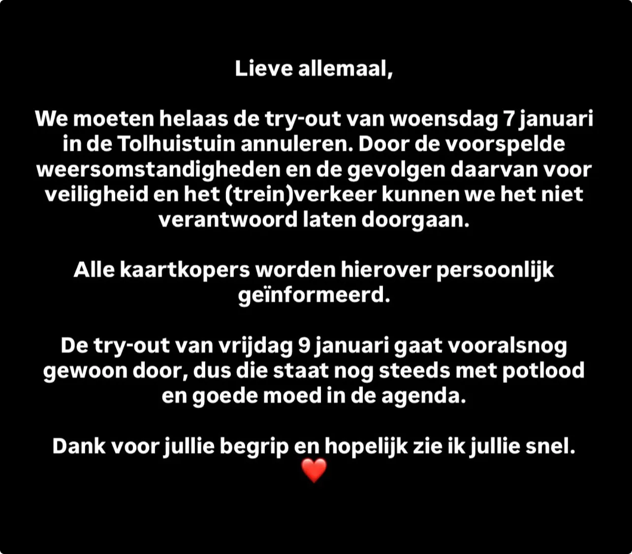 Antoon benadrukt dat hij zijn publiek veiligheid wil bieden, iets wat door het voorspelde winterweer niet te garanderen is. Je merkt in zijn woorden dat hij de teleurstelling begrijpt, maar dat zijn prioriteit helder blijft. De zanger legt uit dat treinverkeer mogelijk in de knel komt en dat het hierdoor niet verantwoord voelt om de try-out door te laten gaan. Hij vertelt dat kaartkopers persoonlijk worden geïnformeerd, zodat iedereen precies weet waar hij of zij aan toe is. Door zijn duidelijke communicatie houd je het gevoel dat de artiest dichtbij zijn fans staat.