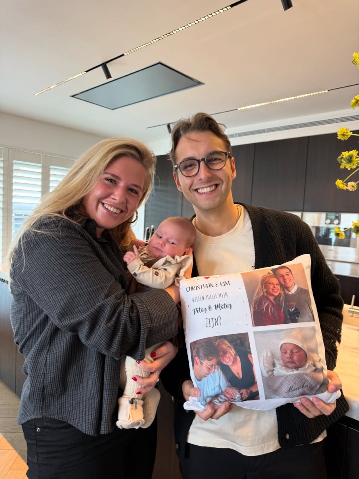 Op de gedeelde foto houdt Christiaan een kussentje vast waarop drie foto’s staan, samen met de tekst: “Christiaan en Kim, willen jullie mijn Peter en Meter zijn?” Het moment spreekt boekdelen. Het stel straalt trots uit en de glimlach op Christiaans gezicht zegt alles. In zijn Instagram-story schreef hij later: “Echt een eer.” Het lijkt erop dat ze geen seconde hebben getwijfeld om deze bijzondere taak op zich te nemen. De reacties onder de post stromen binnen. Van fans die ontroerd zijn tot familieleden die het stel feliciteren.